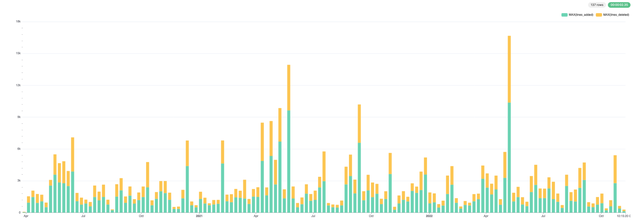 FROM s3('https://datasets-documentation.s3.amazonaws.com/github/commits/clickhouse/commits.tsv.xz', 'TSV', 'hash String,author LowCardinality(String), time DateTime, message String, files_added UInt32, files_deleted UInt32, files_renamed UInt32, files_modified UInt32, lines_added UInt32, lines_deleted UInt32, hunks_added UInt32, hunks_removed UInt32, hunks_changed UInt32')