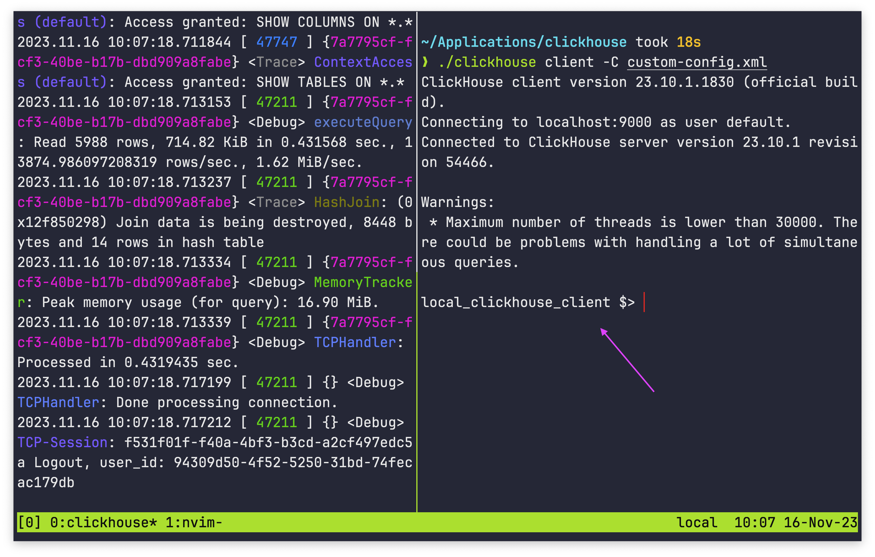 ./clickhouse serverIn a new terminal window, start the Clickhouse client with the